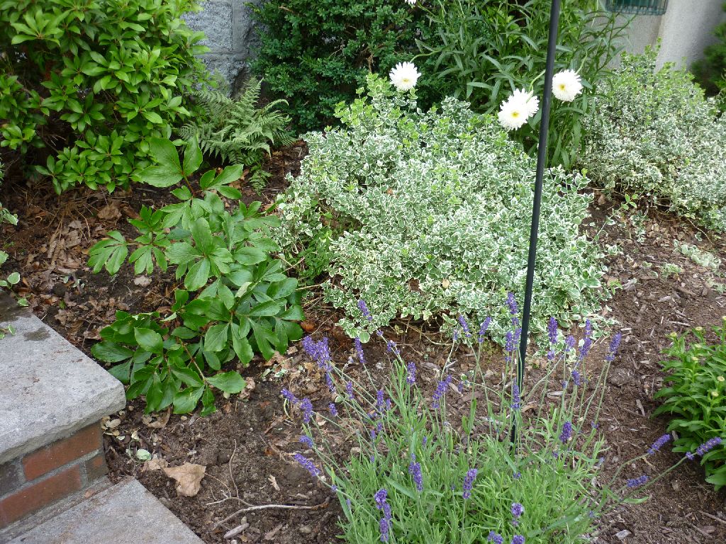 | June 10: some tall daisies, as well as a ghost fern, went in the back and a peony and lavender are closer to the front |